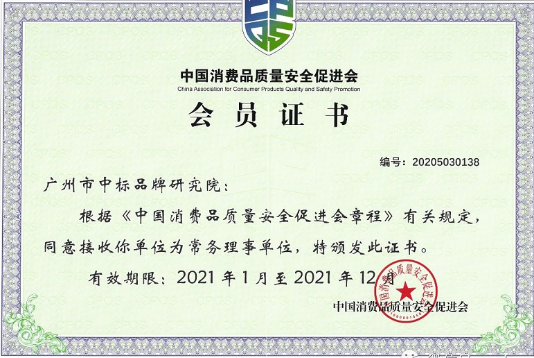 近日获悉,广州市中标品牌研究院被中国消费品质量安全促进会接收为常务理事单位。
